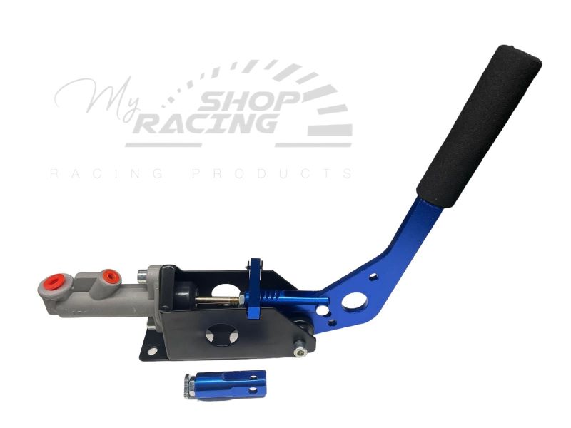 Freno a mano con pompa integrata, modello economico. Realizzato in ferro e alluminio, leva anodizzata blu e impugnatura ergonomica rivestita.