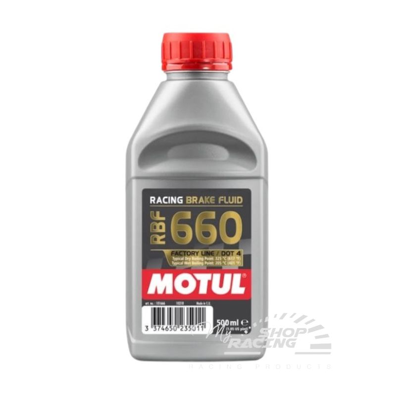 Il fluido freni MOTUL RBF 660 RACING è un prodotto 100% sintetico di altissima gamma, formulato per soddisfare le esigenze estreme dei sistemi frenanti da competizione. Per tutti i tipi di attuatori idraulici di freni e frizioni che richiedano un fluido sintetico non siliconico. Sviluppato per resistere alle temperature estreme generate nei freni da competizione ceramici o in carbonio, permettendo un flusso di aria per il raffreddamento minore. Può essere utilizzato anche con dischi freni in acciaio convenzionali. Supera le richieste degli standard DOT 3, DOT 4 e DOT 5.1 (ad eccezione della viscosità a -40°C del DOT 5.1).