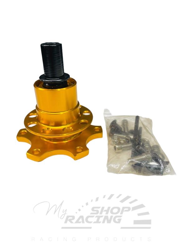 Mozzetto volante universale a sgancio rapido maschio in acciaio da saldare al piantone. Foratura fissaggio volante standard.