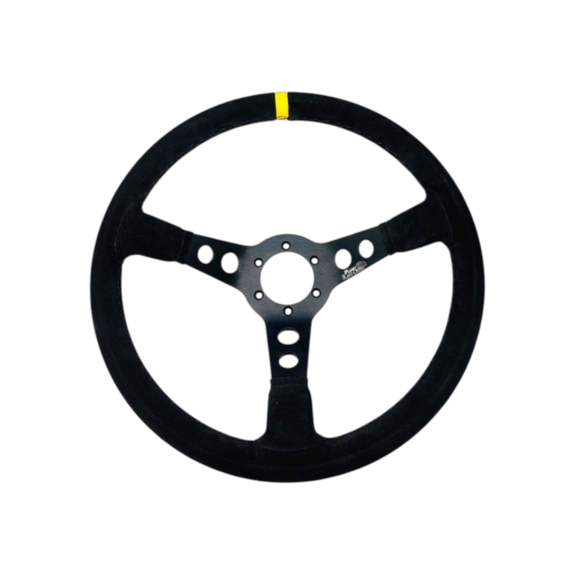 Volante fabbricato in Italia, di alta qualità, modello a calice. Razze in alluminio anodizzato nero, rivestimento esterno scamosciato con inserto giallo. Diametro esterno 350 mm